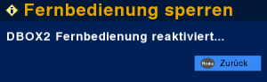 Um die Sperrung der Fernbedienung der DBox2 wieder aufzuheben, muss die Tastenkombination [rot] und [d-box] innerhalb von etwa 3 Sekunden nacheinander gedrückt werden.