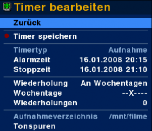Durch Drücken von "OK" auf der Fernbedienung kann ein Timer bearbeitet werden. Hier kann der komplette Timer noch einmal bearbeitet werden. Mit Ausnahme des Timertyps und des Senders sind alle Werte variabel.
