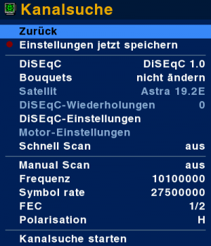Hinweis: Es ist empfehlenswert, die Option "Einstellungen jetzt speichern" zu betätigen, sobald neue Kanalsuche-Einstellungen getätigt wurden, für den Fall, dass ein Reset der DBox2 nötig sein sollte.