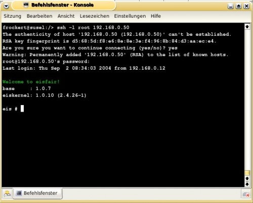 Nach der erfolgreichen Installation kann man sich nun mittels SSH (Linux-Konsole oder Windows-Putty) auf dem Eisfair einloggen.