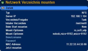Durch Selektion und Druck auf [OK] werden die vorgenommenen Änderungen übernommen, und versucht das Verzeichnis zu mounten. Achtung! Die Einstellungen gehen bei einem Neustart verloren, sofern diese nicht noch zusätzlich in den Neutrino:Einstellungen mit der Option "Einstellungen jetzt speichern" bestätigt werden.